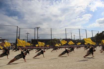 列が交わる交差行動から始まった2曲目。一人一人の倒立技やフラッグを取り入れたパフォーマンスなど,見どころたくさんでした!最後には全員で見事なピラミッドを完成させることができました!