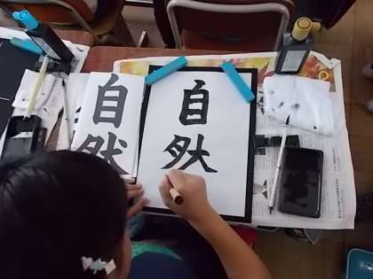 今日,学習した文字は『自然』です。画数が多いので,半紙の中にバランス良く収めることに苦戦していました。それでも集中して熱心に取り組んでいました。
