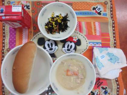 今日の献立は, 「じゃがいものクリームシチュー・ひじきのソテー・コッペパン・牛乳」でした。今日の「ひじきのソテーには, えだ豆が入っていました。えだ豆の緑・にんじんの赤・コーンの黄と色どりもきれいでした。