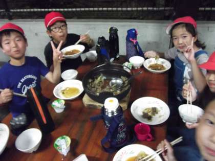 夜ご飯は,野外炊事で「すき焼き風煮」を作って食べました。手際よく食材を調理し,火もうまくつきました。おいしいすき焼き風煮ができ,どこの班も完食でした。日が暮れて心地よい風が吹いていました。
