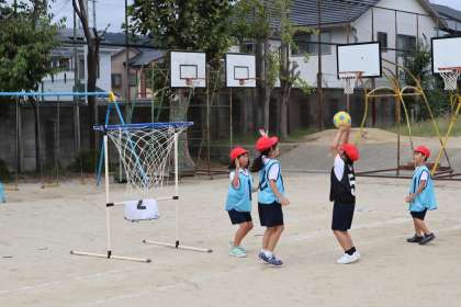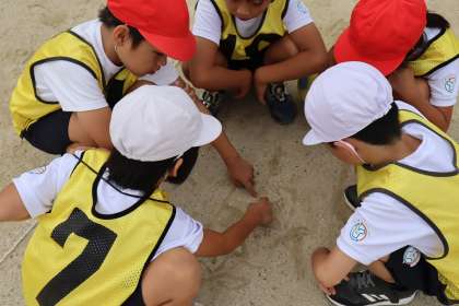 ねらい1の「ルールやゲームの進め方に慣れる」から「せめ方やまもり方をくふうする」に変わりました。チームごとに作戦会議をする中で、「三角形を作って攻めよう!」「相手にとられないように高いパスをだそう!」など、様々な工夫が出ました。