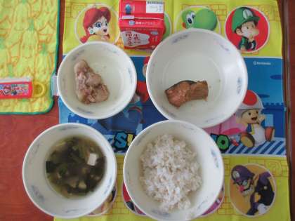 今日の献立は, 「さばのみそ煮」「さといもとこんにゃくの土佐煮」「とうふの吉野汁」「麦ごはん」「牛乳」でした。さばの骨をとるのがみんな結構上手でした。時間はかかったけれども, おはしを使って丁寧に身をとって食べていました。汁物は, 大好きで毎回残ることはほとんどありません。