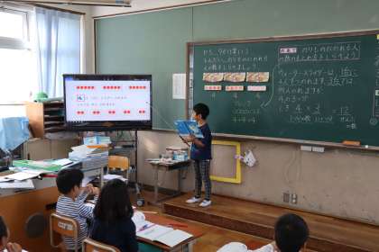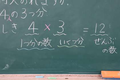 今日の算数は、4の3つ分という言葉は、4×3という式で表すことができるということを学習しました。
