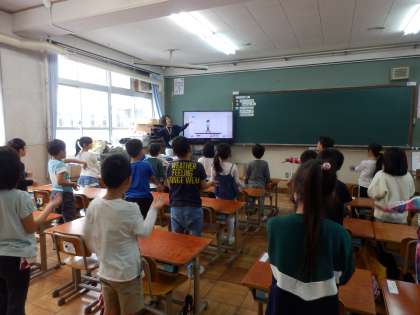 英語でのあいさつの仕方を歌などで覚えたりと,