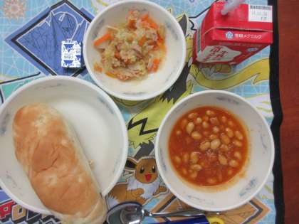 今日の献立は, 「ポークビーンズ」「ツナとキャベツのソテー」「あじつけコッペパン」「かくチーズ」「牛乳」でした。