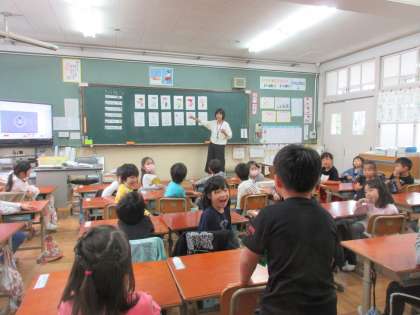 世界の国の色々な国のあいさつを学習しました。少しはずかしそうにしていた子もだんだんと声が大きくなり, 歌をうたったり, あいさつができたりするようになりました。