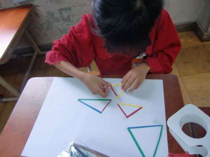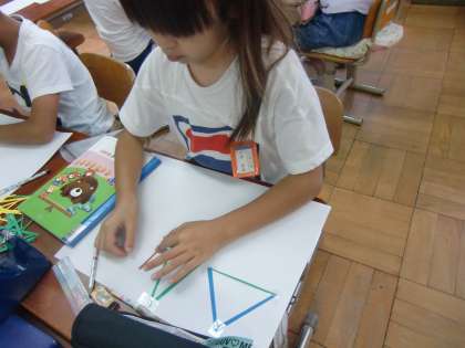 まずは4色の画用紙でできた棒を使って,いろいろな三角形をつくりました。
