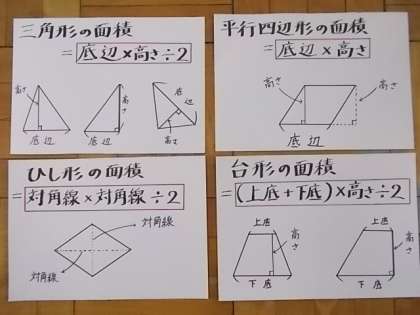 算数科「面積」の学習が終わり,あとは単元テストとなります。今回習った「三角形」「平行四辺形」「台形」「ひし形」の面積の公式がこれからも様々な場面で必要となります。しっかりと復習をして,テストにのぞんでほしいと思います。