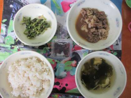 今日の献立は, 「牛肉とれんこんの煮つけ」「大根葉のごまいため」「すまし汁」「しば漬」「ごはん」でした。しば漬は京都の三大漬物の一つです。左京区の大原で昔から作られてきました。給食のしば漬は, なすと赤じそと塩だけを使い, 昔ながらの方法で作られています。
