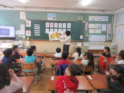 今日の学習は,「I like blue.」好きな色を英語で友達に伝えます。絵本でいろんな色の動物のあてっこをした後, グループで「I like 〜」にチャレンジしました。照れながらも元気よく活動できました。