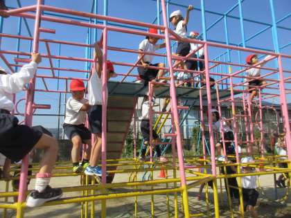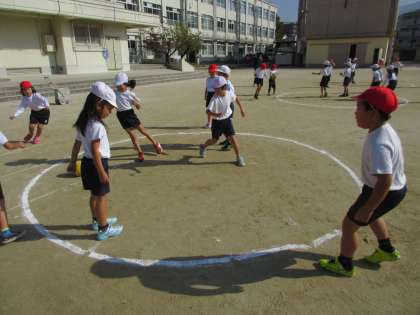 「ころがしドッジボール」を今日は, グループ対抗で練習しました。円の中の人は, ボールに当たらないように, 外の人は, すばやくボールをころがしたりして作戦をたてながら楽しく活動しました。後半は, 総合遊具で二種類のすべり台をめざして落ちないようにしっかりと棒をにぎりながら遊びました。