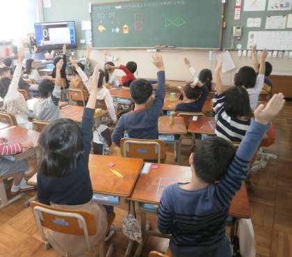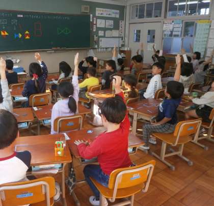 今日は算数科の「かたちづくり」の学習で,最初に作った形から,指定された数だけ色板や棒を動かして別の形を作るという学習をしました。次々に手を挙げ,発表してくれました。