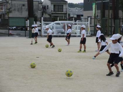 今日から, 「ボールけりゲーム」に入りました。まずは, ボールをけることに慣れる練習をしました。決まりを守って楽しく友達とゲームができるように練習していきます。攻めと守りを考えてグループで作戦も考えていきます。
