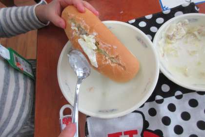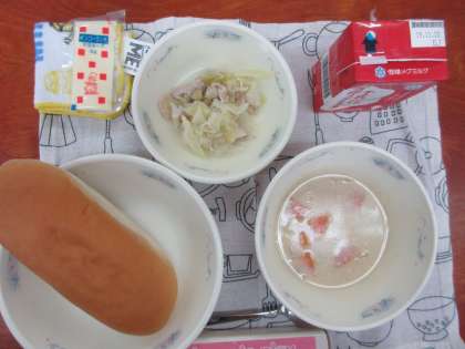 今日の献立は, 「チャウダー」「ハムサンドの具」「マヨネーズ」「コッペパン」「牛乳」でした。食べ方は, まず, ハムサンドの具に, マヨネーズをかけてまぜます。次に, スプーンを使ってパンを開きます。そして, ハムサンドの具をはさみます。特製のハムサンドを大きな口を開けておいしそうに食べていました。