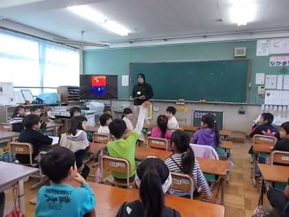 読書週間の取り組みで学年の先生の読み聞かせがありました。1組は,[Five little monkey],2組は「ぼくはアフリカのキリンといいます」を読み聞かせに来てくれました。子どもたちは,楽しみながら,聞いていました。