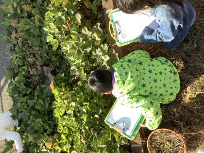 春に植えたサツマイモを観察しに行きました。まだ,葉に色づきが見られないのが少し残念でしたが,どのように成長していくのかを楽しみにしている子どもたちでした。
