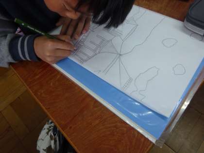 建物の形やデザイン、風景の様子にこだわりながら、下絵を描きました。