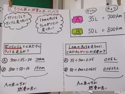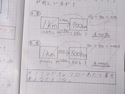 算数科では「単位量あたりの大きさ」の学習を進めています。様々な数量を比べる時に「1あたり量」に注目するという複雑な問題が多くあります。授業中は今まで以上に集中して,関係図をかいています。