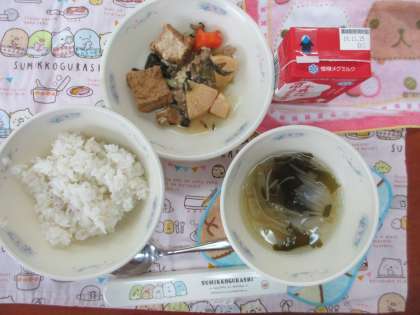 今日の献立は, 「厚揚げのオイスターソースいため」「わかめスープ」「麦ごはん」「牛乳」でした。