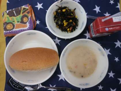 今日の給食は,「きのこのクリームシチュー」「ひじきのソテー」「ぜんりゅうふんパン」「牛乳」でした。