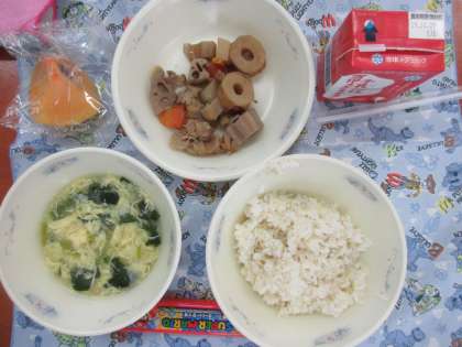 今日の献立は, 「筑前煮」「かきたま汁」「麦ごはん」「牛乳」「柿」でした。