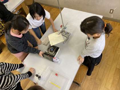 示温テープや,ロウを使って,金属と水の温まり方を観察し,ときには「おーーー!」というような声もあり,実験結果から温まり方について考えることができました。