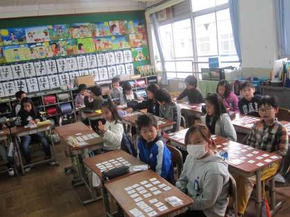 小文字のアルファベットカードでビンゴ遊びをしました。先生が言った言葉のアルファベットカードを裏返していき,ビンゴを狙います。ゲームをしながら,少しずつ小文字のアルファベットに慣れていきます。