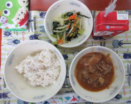 今日の献立は,「麦ごはん」「ビーフストロガノフ」「小松菜のソテー」「牛乳」でした。