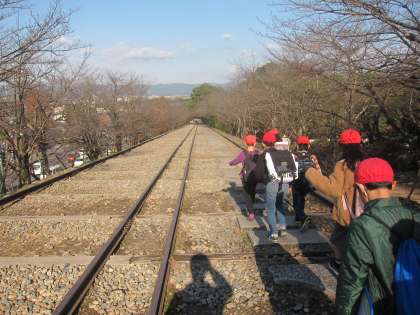 その後,水路閣を見学に行きました。「電車が通るところかな?」と予想していた子もいましたが,水の流れる音を聞いて,疏水に関係があるものだと気が付きました。
