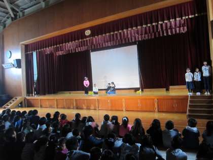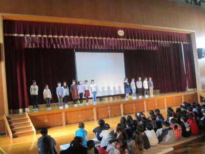 お年寄りの方について調べたグループの舞台発表の様子です。総合で考えたことや,福祉まつりに参加して気づいたこと,調べ学習でわかったことなどを発表しました。子どもの持つ,お年寄りのイメージが総合の学習を通して,変わっていきました。ただ,助けるのではなく,お年寄りの方とお互いに協力して生活していくのが大事というのを伝えてくれました。