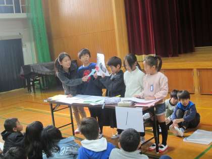 学習発表会のブース発表の様子です。何度も発表練習を行い,どうすれば相手に伝わりやすいのかということを考えながら進めてきました。グループごとに棒を自作したり,大きな絵を準備したりと,工夫してできました。