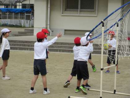 体育のパスゲームの学習が始まりました。ボールの受け渡しを素早くしながらゴールへとつなぎます。シュートがもう少しのところで, ボールをカットしたり, 向かって来る相手を上手にかわしながらパスを渡したりとはじめてとは思えないほどです。