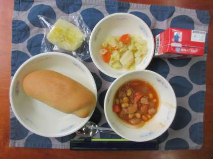 今日の給食は, 「コッペパン」「ポークビーンズ」「野菜のホットマリネ」「りんご」「牛乳」でした。