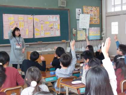 大豆が様々な調理方法で姿を変えていることについて学習しました。国語科で学習したことで知っている食品があったり,初めて知る食品にワクワクしたり楽しみながら学習しました。