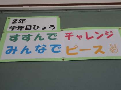 さて,今年の2年生の学年目標は,「すすんで チャレンジ みんなで ピース✌」です。