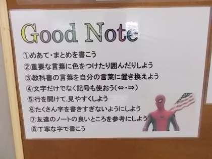 長い休校中ですが,勉強ははかどっていますでしょうか。良いノートを作ってもらうために,ポイント的なものを用意しました。このポイントの中で難しいのは教科書に書かれていることを,自分の言葉に書き換えるということではないかと思います。しかし,勉強したことを自分のものにするためには大事なことなので,皆さんもこのポイントを意識して自主学習など取り組んでもらえたらと思います。