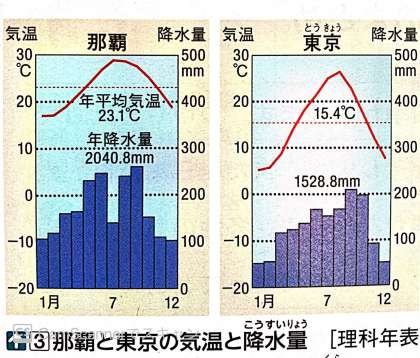 那覇と東京のグラフを比べてみて,沖縄の気候の特ちょうを考えてみよう。