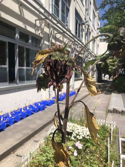 花がかれて ぐったりしているように 見えますが、ひまわりは ある じゅんびを はじめているのです。
