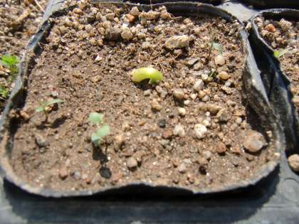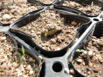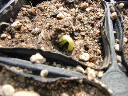 ツルレイシが土の中から一生懸命,芽を出そうとしているところです。土をどけて顔を出そうとしていますね。その力強さが伝わってくるような写真ですね。