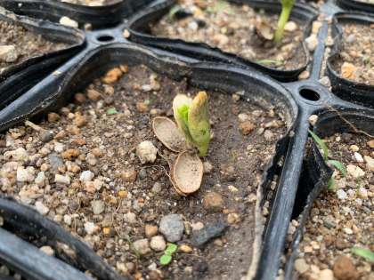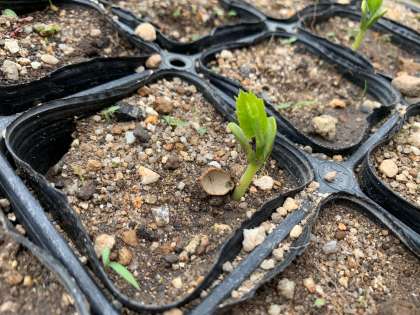 ツルレイシがどんどん芽を出しています。この写真は芽の下に2つに分かれた「から」のようなものがありますね。これは何でしょう。