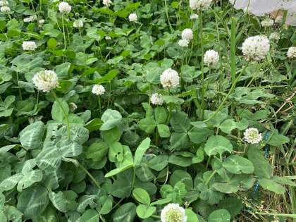 「シロツメクサ」ですね。漢字では「白詰草」と書くそうです。オランダからのガラスの詰め物として入ってきた事から白い詰め物となった草という事で「白詰草」の名がついたそうです。