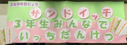 ところで,3年生の学年目ひょうをまだ,みなさんにしょうかいしていなかったので,しょうかいしたいと思います。今年の3年生の学年目ひょうは,「サンドイッチ〜3年生みんなでいっちだんけつ〜」です。