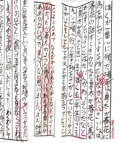 あと,感想は「自分だったら」「理由は」を意識して書くと深くなります。「春花が馬の名前がつけられなくなって,かわいそうでした。」これだと,自分の感想は「かわいそうでした。」だけですよね。これでは,高学年らしい作文とは言えません。そこに,自分だったらどうかと考えて書いたり,そう考えた理由をつけ加えたりすると作文に深みが出てきます。ぜひ意識してみて下さい。