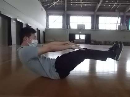 背中と足がゆかにつかないように常にうかしておきましょう。その姿勢をキープするだけでトレーニングになります。