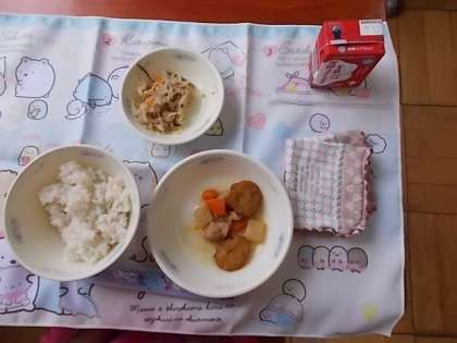給食当番さんが協力しておかずや牛乳などを配ってくれました。