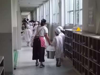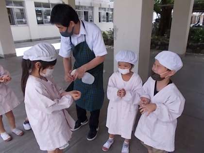 給食当番さんは給食室に入る前にもしっかり消毒をします。