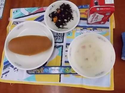 今日の献立は「黒糖コッペパン・牛乳・じゃがいもクリームシチュー・ひじきのソテー」でした。