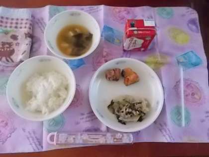 今日の給食は「ごはん・牛乳・さけの塩こうじあげ・小松菜と切干大根の煮びたし・みそ汁」でした。