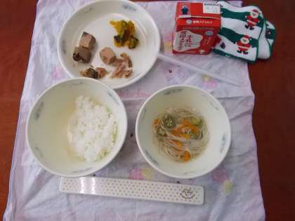 今日の献立は「ごはん・牛乳・なま節のしょうが煮・かぼちゃの煮つけ・七夕そうめん」でした。