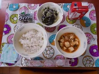 今日の献立は「麦ごはん・牛乳・とうふの四川風・ほうれん草ともやしのいためナムル・じゃこ」でした。